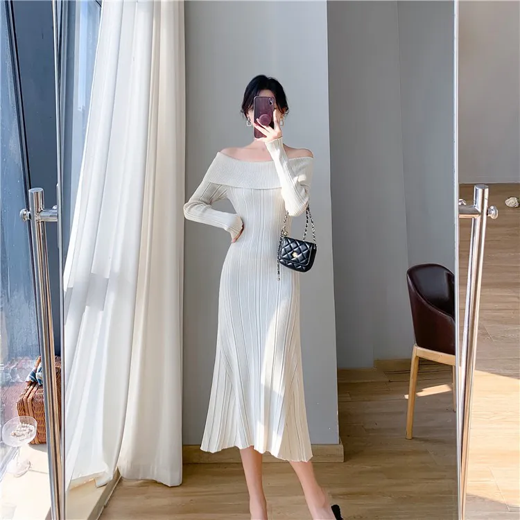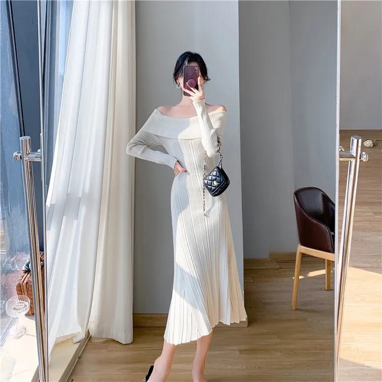 Slim-fit hip-wrapped shoulder-knitted fishtail dress dress
