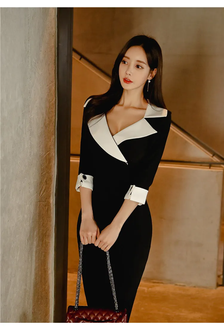 This is a dress with a unique design. It uses a suit collar design, which looks very neat. The color is black and white splicing, which is classic and fashionable. The seven-quarter sleeve design adds a bit of elegance and a certain practicality. At the same time, this dress also has a waist design, which can highlight the wearer‘s slender waist. The hip wrap style shows the curvature of women.